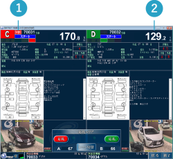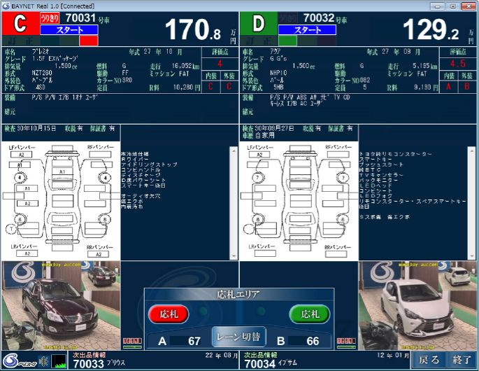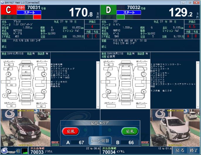 (セリ画面は、A BレーンかC Dレーンを選択。奇数号車はA Cレーンで赤色です。偶数号車はB Dレーンで緑色です。)