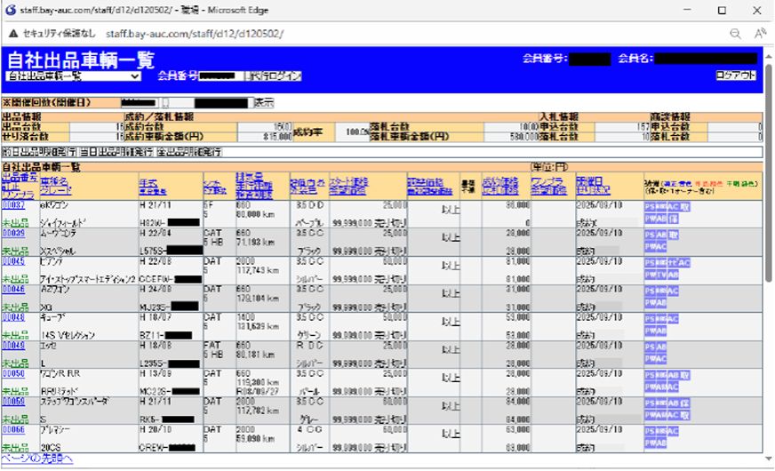 ベイネット:自社出品車輌一覧画面